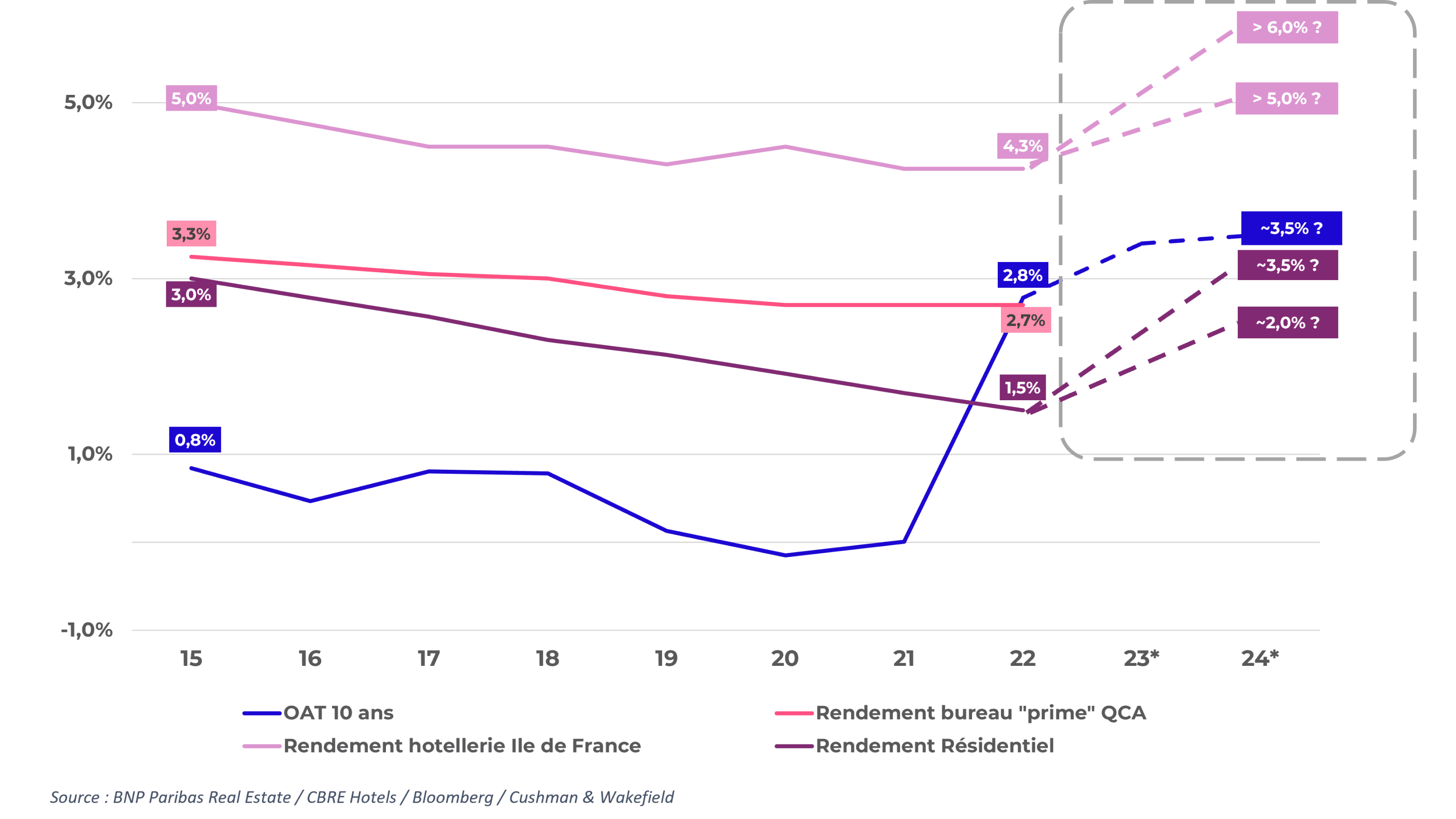 Historiquement, les taux de rendement sont reliés à la variation de l’OAT. Sur la période 2015 / 2020 l’OAT 10 ans français n’a cessé de diminuer provoquant une baisse sur les taux de rendement immobiliers. Depuis 2020, les taux de l’OAT ont augmenté, laissant présager une hausse des taux de rendement immobiliers.